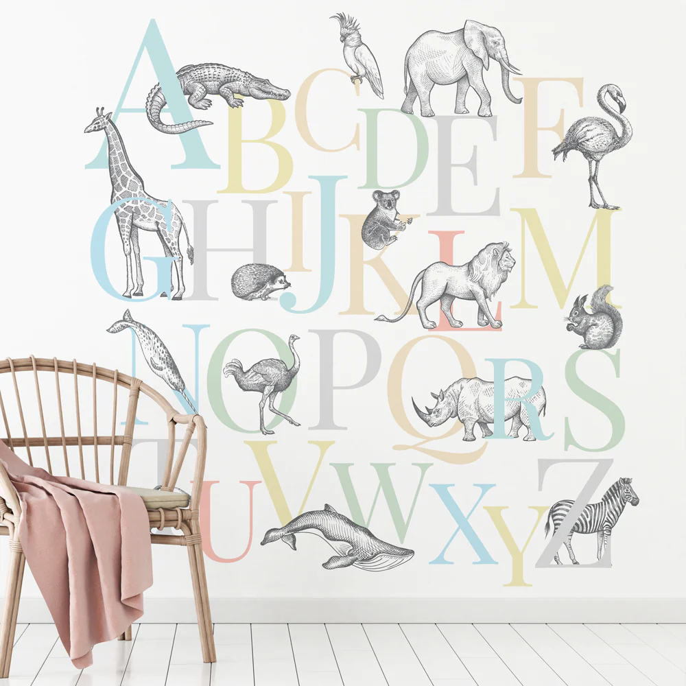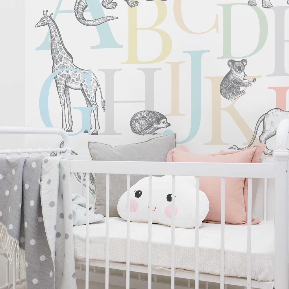 Alphamalia Wallpaper is a charming nursery design featuring vintage-style sketched animals paired with playful alphabet artwork.