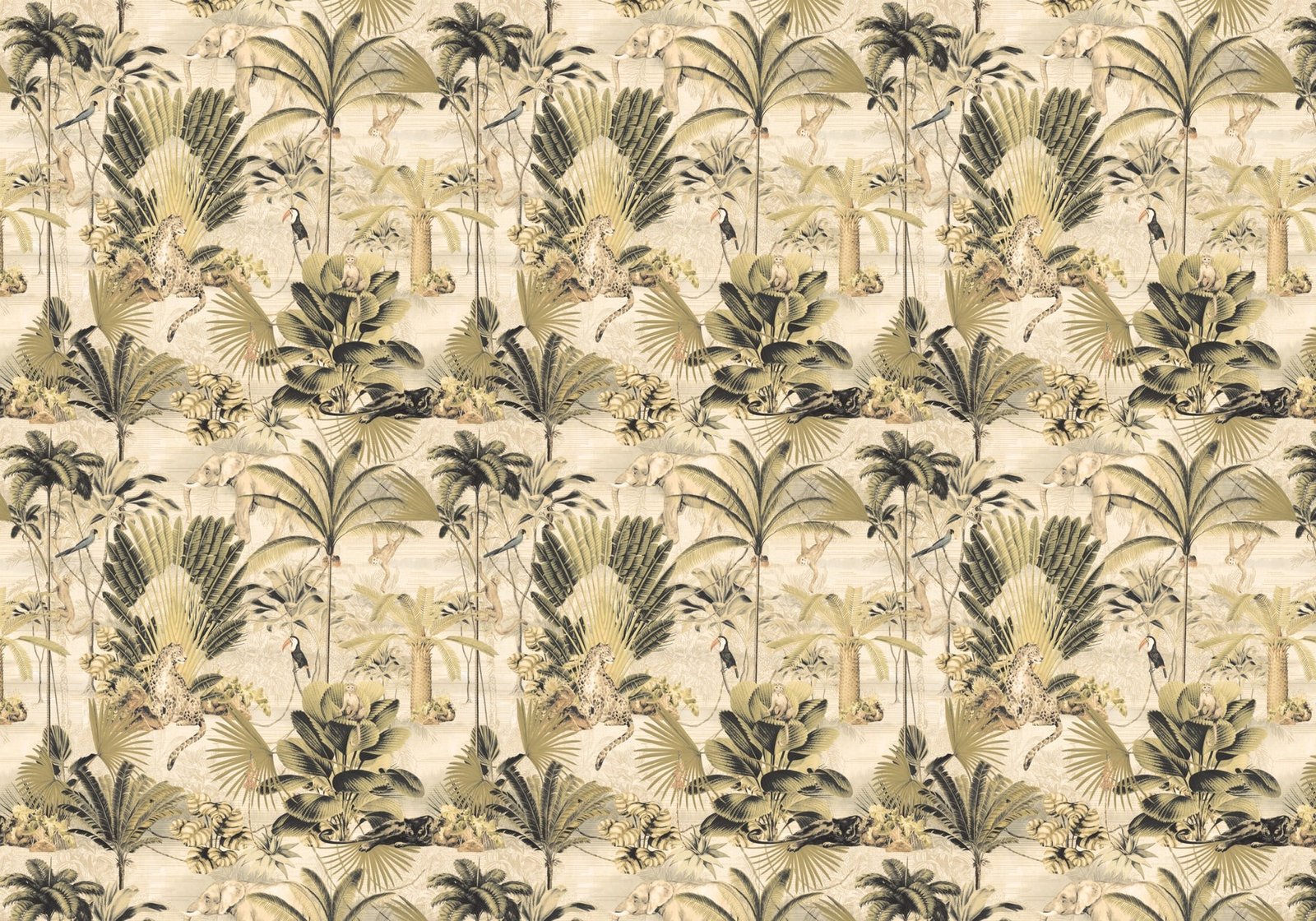 Amazon Auriferous Wallpaper showcases a timeless vintage jungle pattern inspired by Amazonian landscapes.