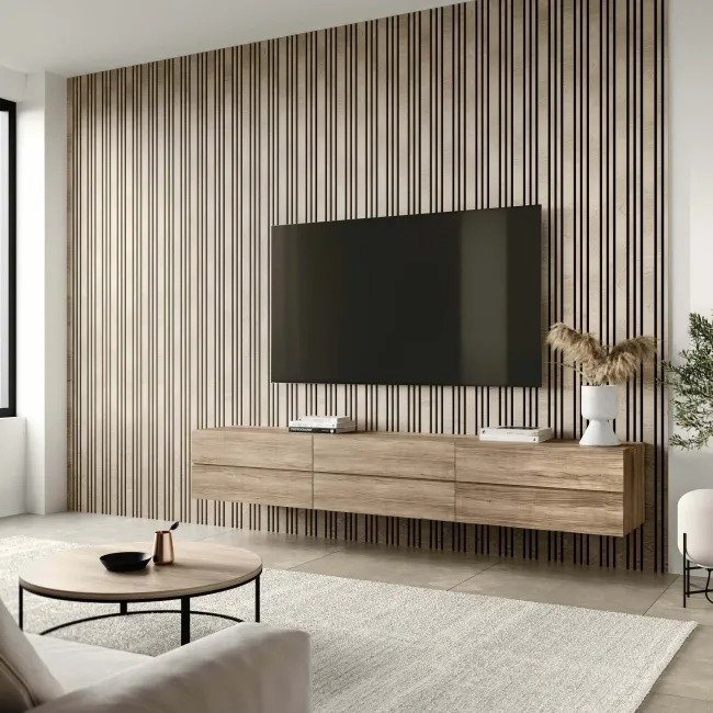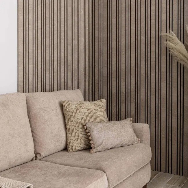 The Beech Multi-Width Acoustic panel features a light beige tone with natural wood grain, creating a warm and inviting atmosphere. Its multi-width slat profile adds depth and style, ideal for walls and ceilings. Acoustic felt backing reduces echoes, while the panels are lightweight, easy to install, and require minimal maintenance.