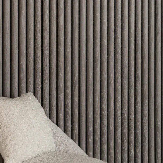 The Silver on Dark Grey Curve Acoustic panel features a bright silver tone with subtle natural variation for a modern, sophisticated look. Its uniquely curved slat profile adds depth and elegance, perfect for walls and ceilings. Acoustic felt backing improves sound absorption while keeping installation simple and maintenance minimal.