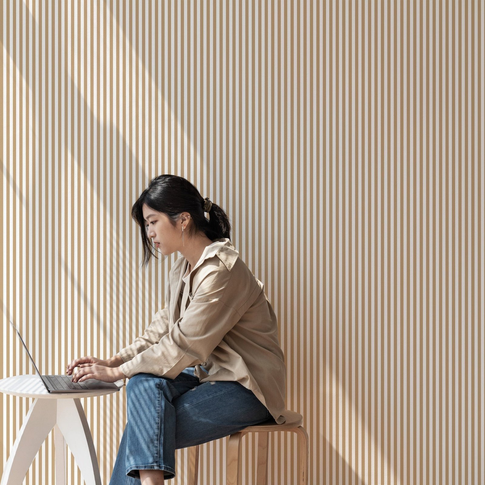 The rich warm toffee stripes on a crisp white background add depth while keeping the space bright.